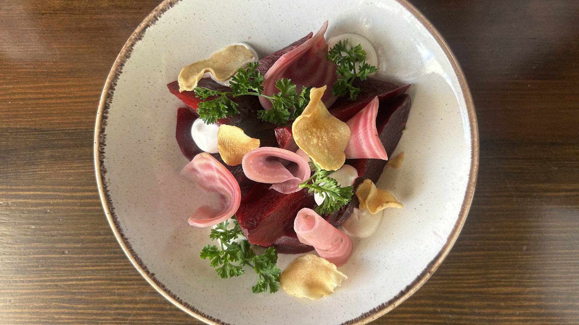 • Sałatka z buraków ćwikłowych, z musem z serka koziego, dopełniona chipsami z topinamburu i marchwi – lekka, kolorowa i wyrazista.